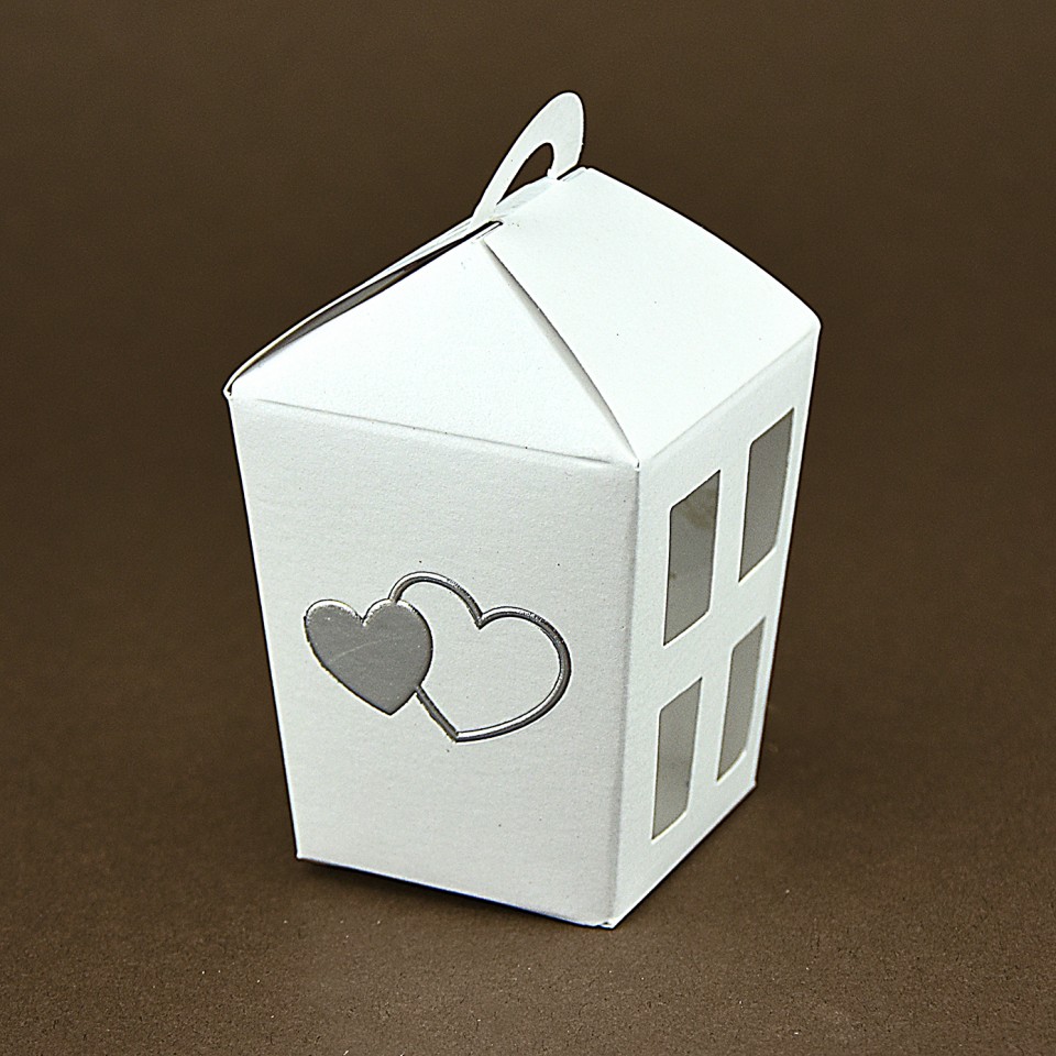 Carta bianca perlata da 250 gr/mq - Lamina a caldo argento e rilievo - Dimensioni: base: 6 cm - altezza: 9,5 cm - profondità: 6 cm - Assemblaggio ad incastro