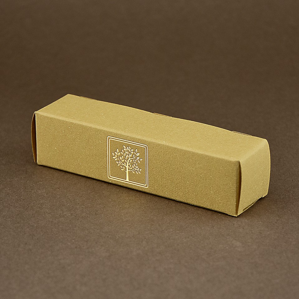 Carta marrone naturale da 250 gr/mq - Lamina a caldo oro - Dimensioni: base: 11 cm - altezza: 3 cm - profondità: 3 cm - Assemblaggio ad incastro
