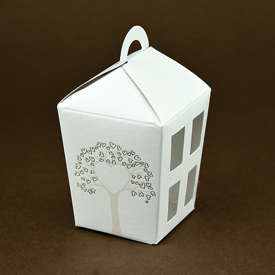 Carta bianca perlata da 250 gr/mq - Lamina a caldo perlata e argento - Dimensioni: base: 6 cm - altezza: 9,5 cm - profondità: 6 cm - Assemblaggio ad incastro