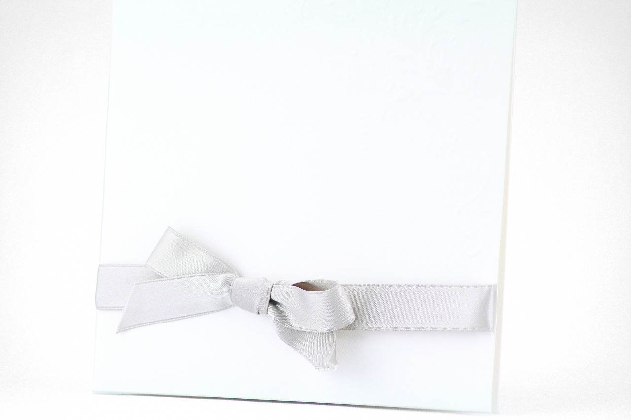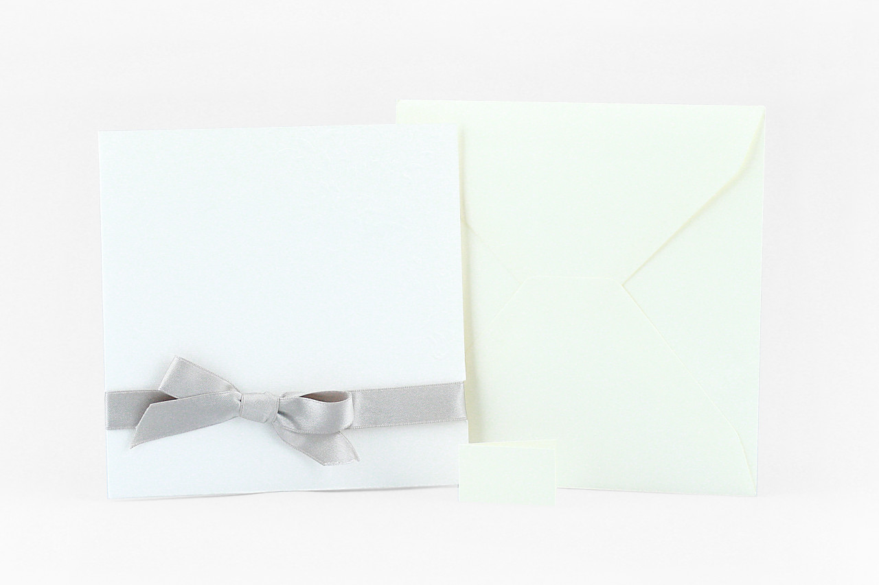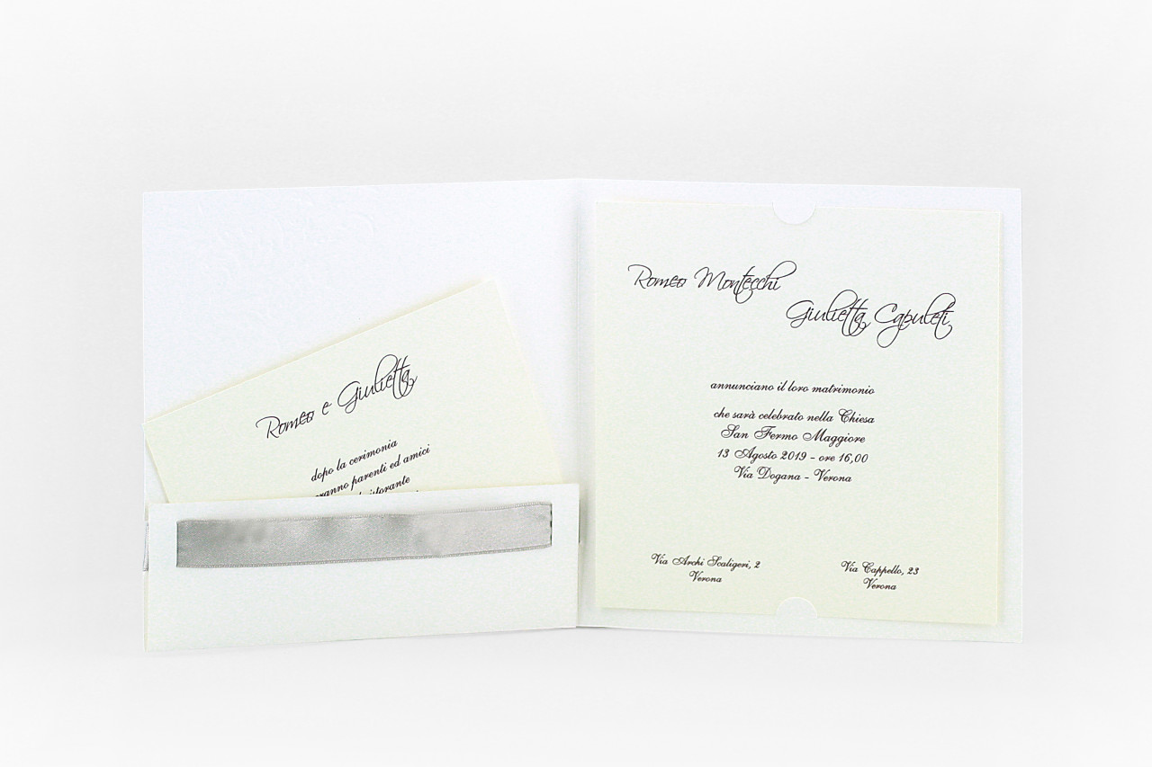 - Formato aperto: 300x150 mm- Formato chiuso: 150x150 mm- Carta Bianca 240 gr /mq (Esterno)- Carta Avorio 170 gr /mq (Interno)- Fiocco con nastro grigio in doppio raso- Busta, invito e biglietto bomboniera inclusi nel prezzo