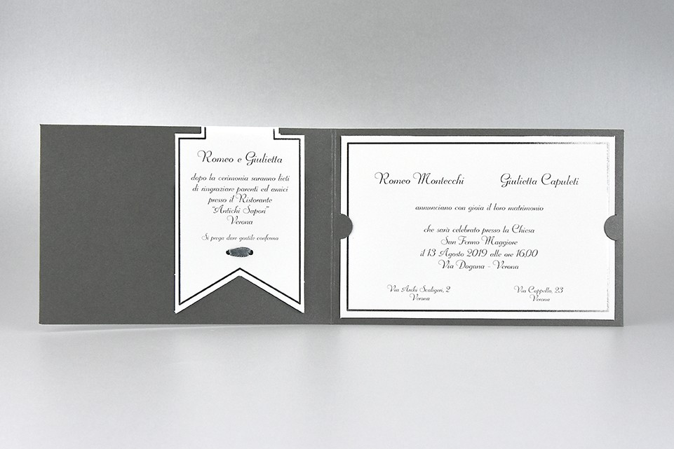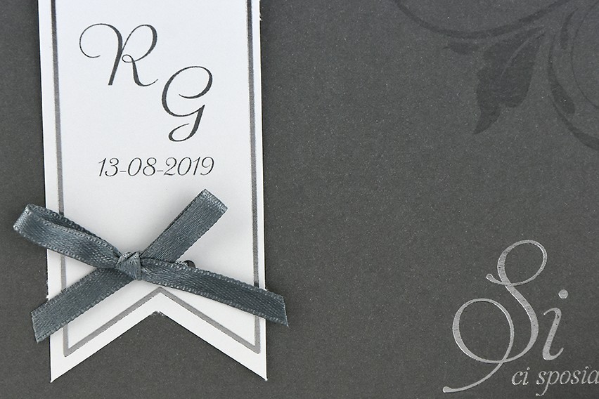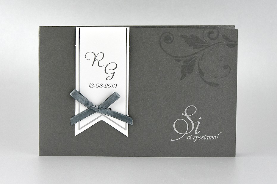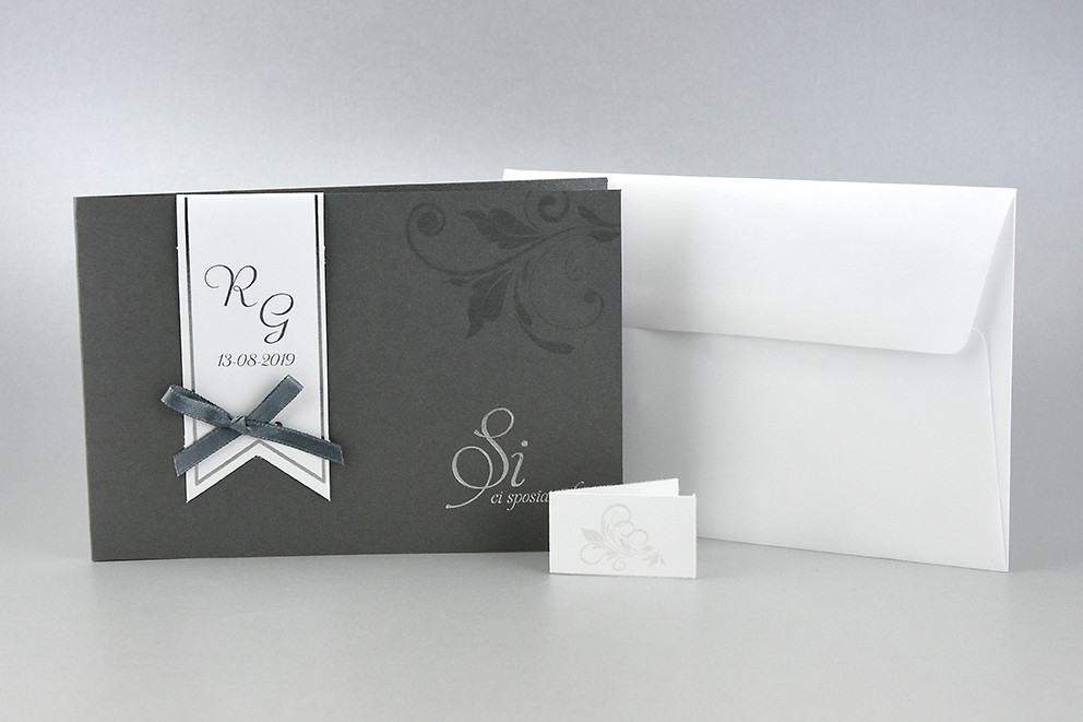 - Formato aperto: 170x230 mm- Formato chiuso: 170x115 mm- Carta Grigio perlato 240 gr /mq (Esterno)- Carta Bianca 170 gr /mq (Interno)- Lamina a caldo argento - Nastro grigio in doppio raso- Busta, invito e biglietto bomboniera inclusi nel prezzo