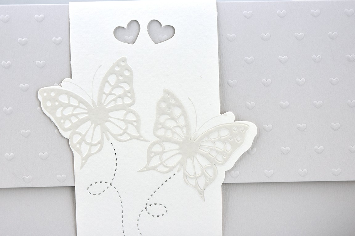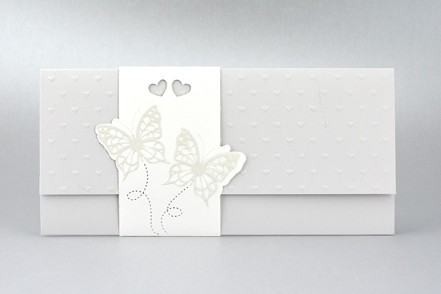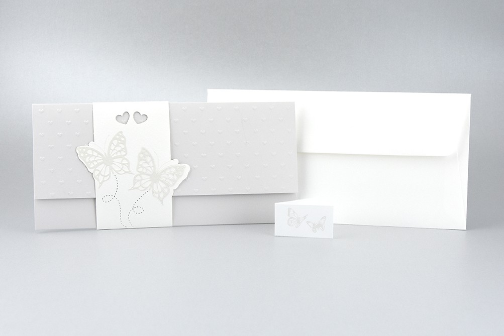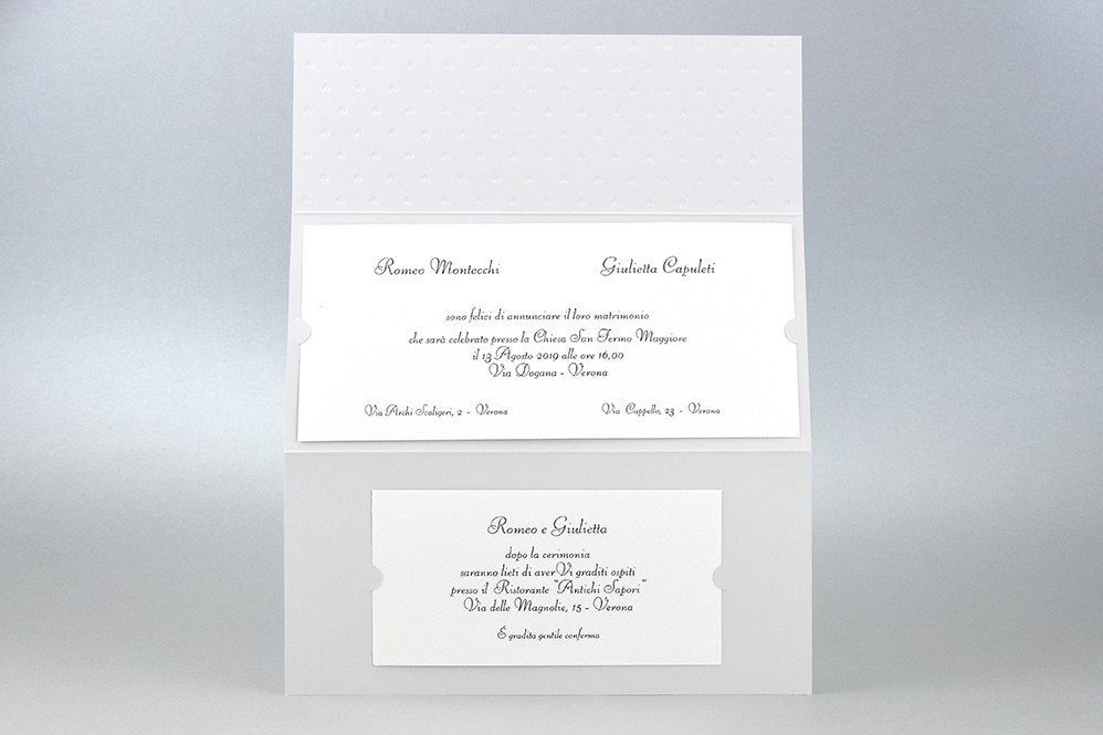 - Formato aperto: 300x210 mm- Formato chiuso: 210x100 mm- Carta Grigia 240 gr /mq (Esterno)- Carta Bianca 170 gr /mq (Interno)- Lamina a caldo perlata e rilievo a secco- Fascetta di chiusura con incastro- Busta, invito e biglietto bomboniera inclusi nel prezzo