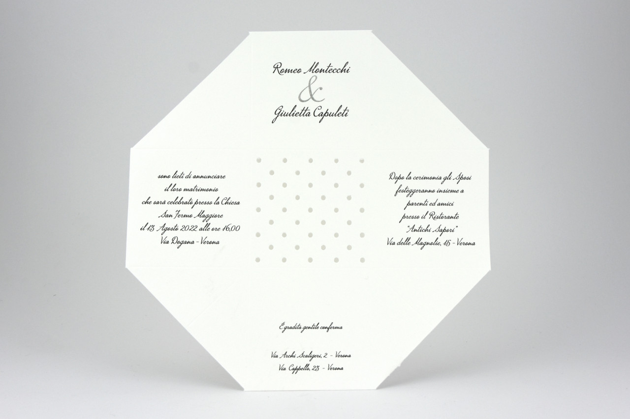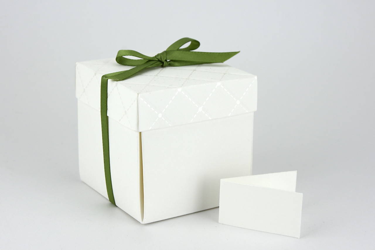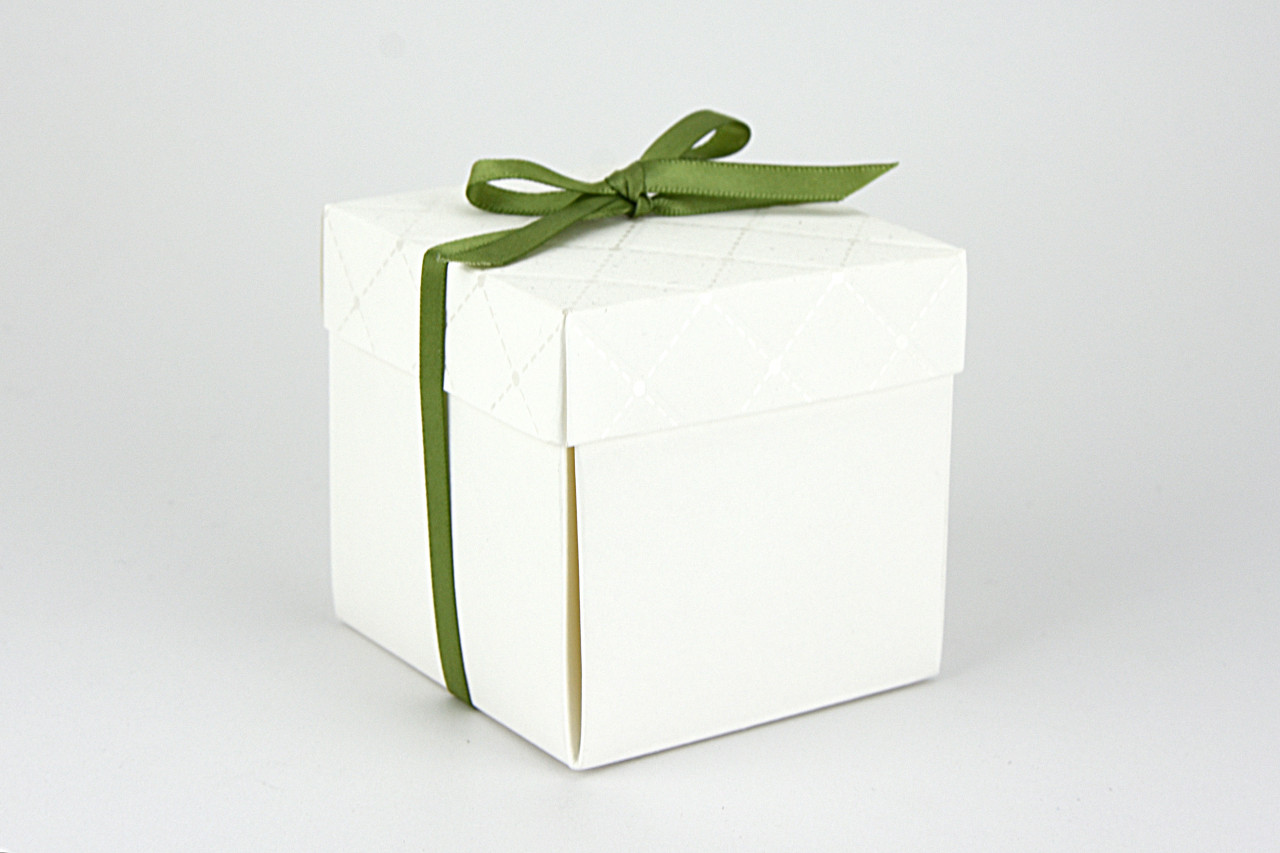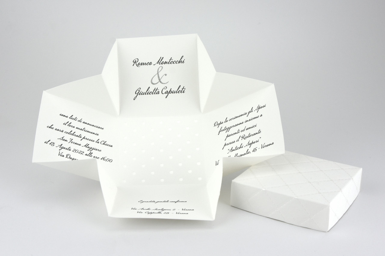 - Formato aperto: 210x210mm- Formato chiuso: 70x70x70 mm- Carta Bianca 240 gr /mq- Lamina a caldo perlata- Nastro in doppio raso- Chiusura ad incastro- Busta, invito e biglietto bomboniera inclusi nel prezzo