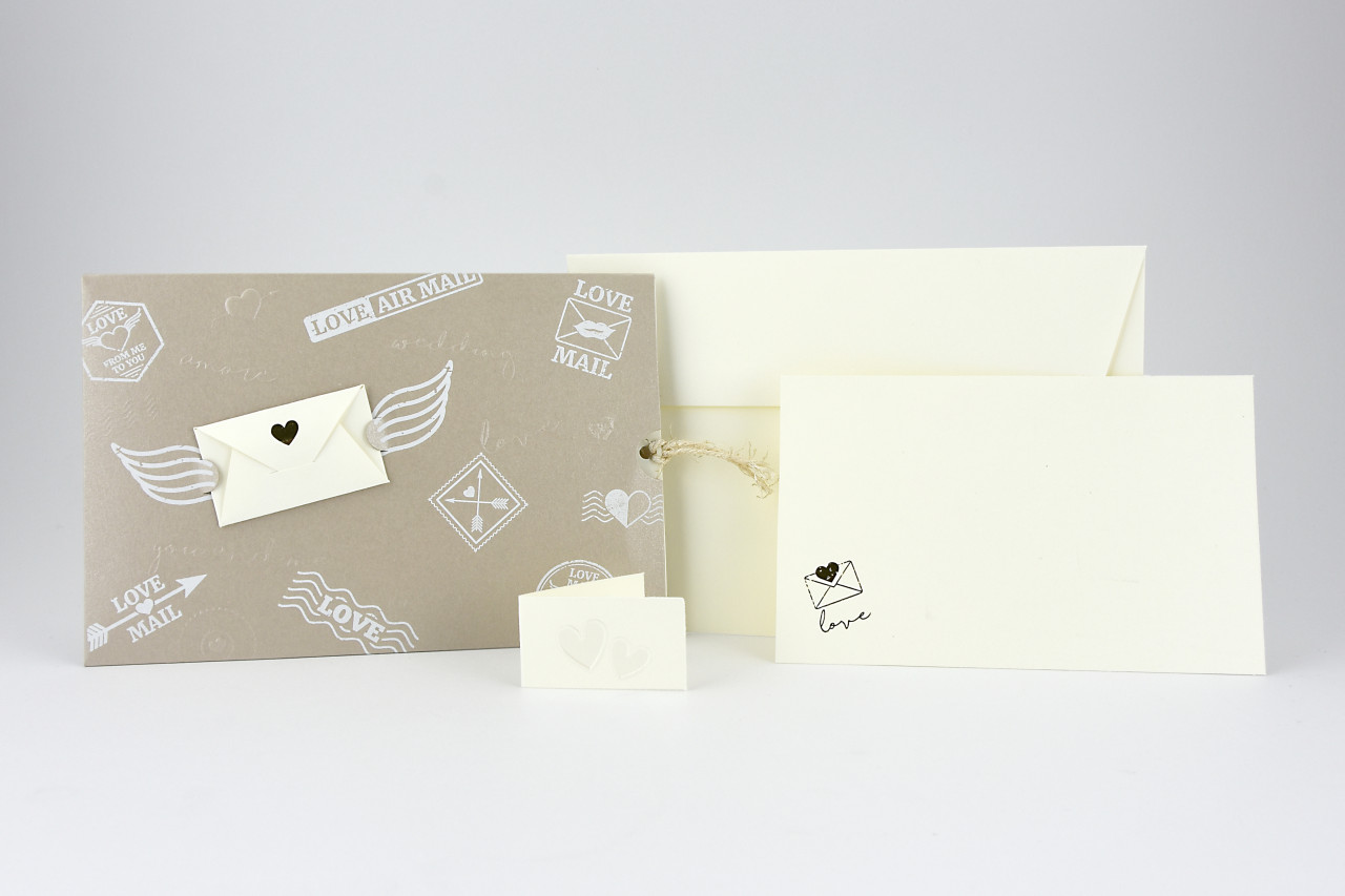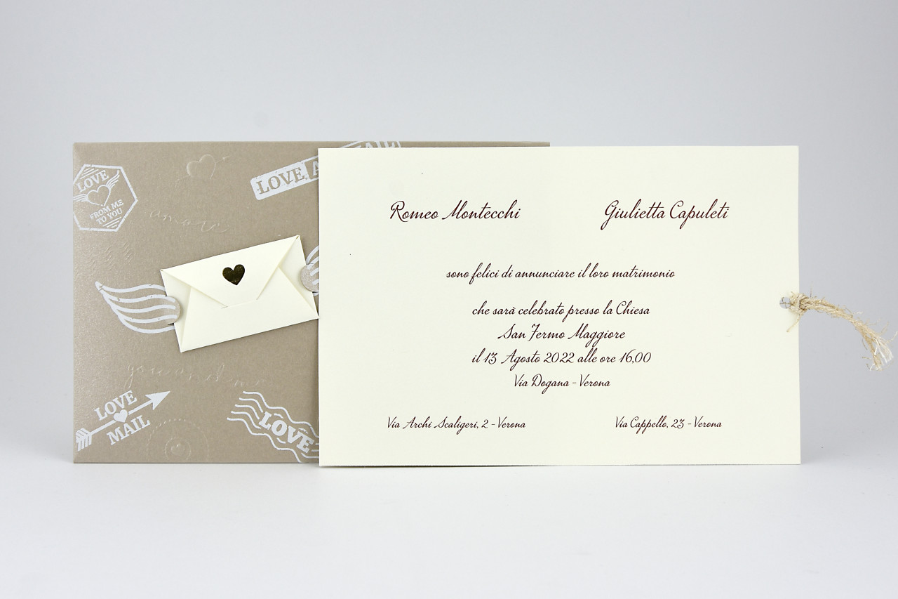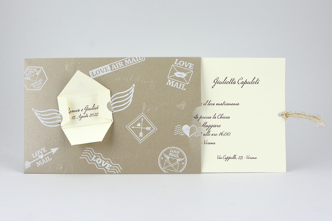 - Formato aperto: 170x115 mm- Formato chiuso: 170x115 mm- Carta Nocciola perlata 240 gr /mq (Esterno)- Carta Avorio 170 gr /mq (Interno)- Lamina a caldo bianca e rilievo a secco- Busta, invito e biglietto bomboniera inclusi nel prezzo