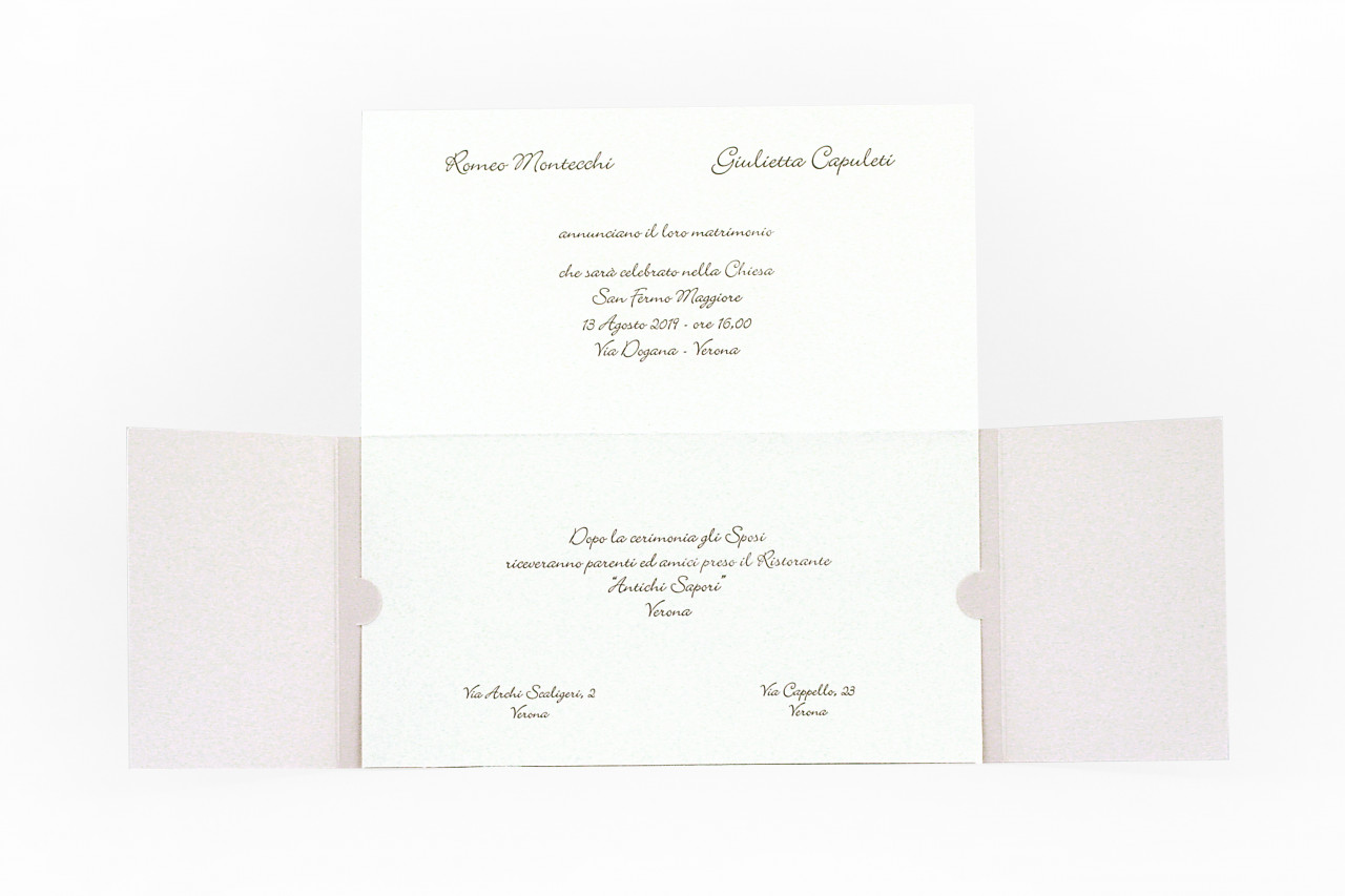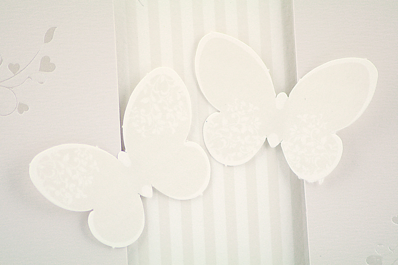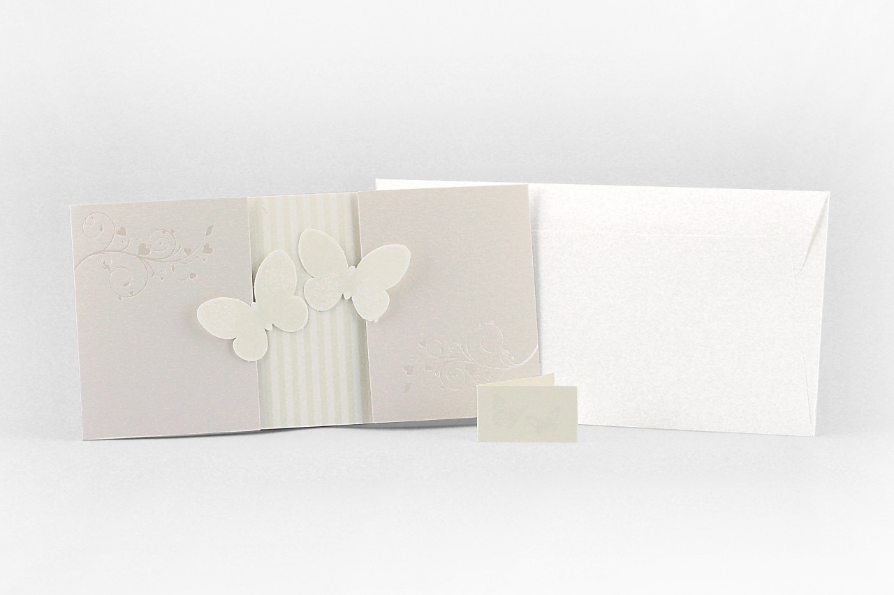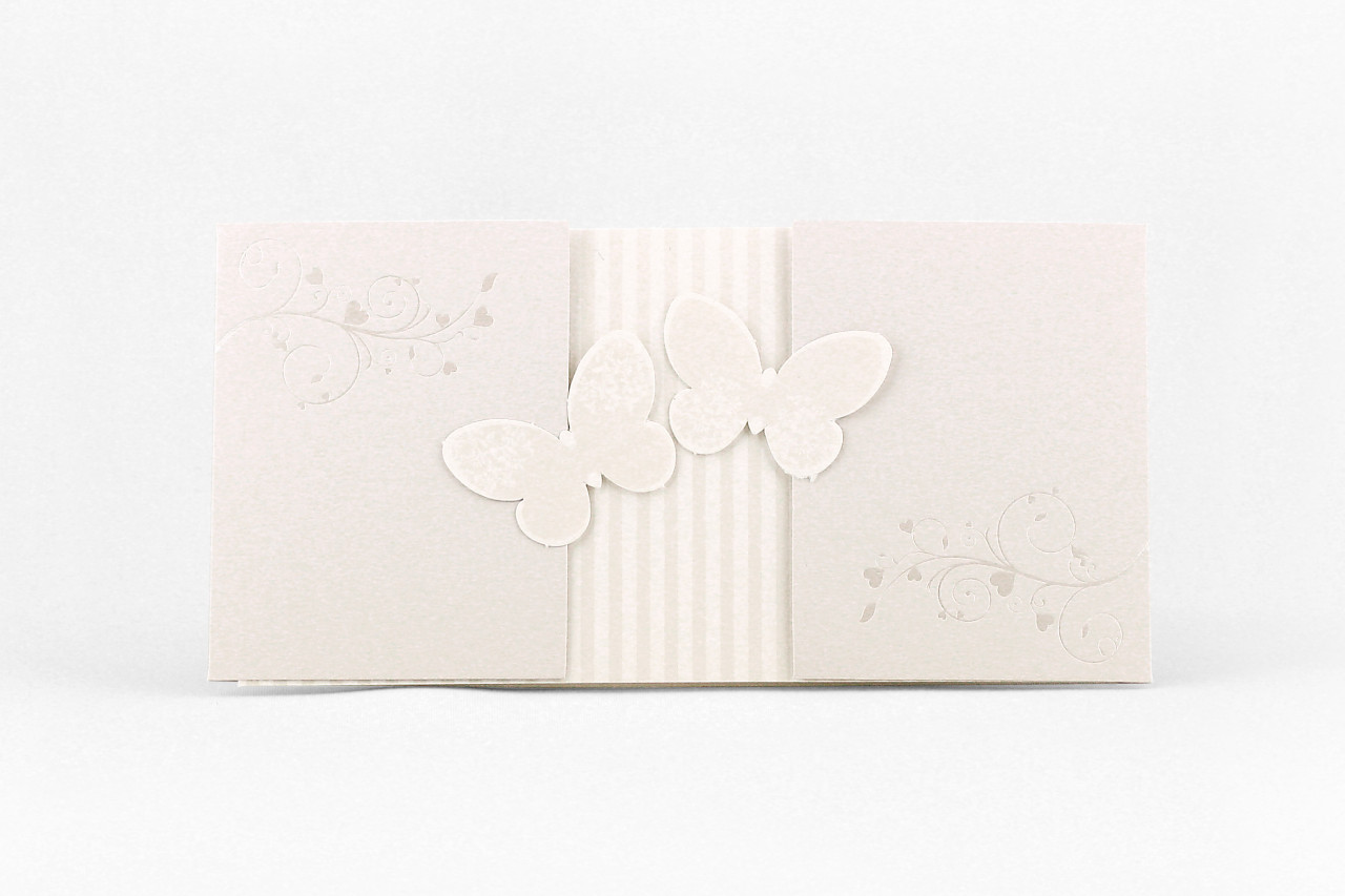 - Formato aperto: 200x210 mm- Formato chiuso: 210x1100mm- Carta BTortora 240 gr /mq (Esterno)- Carta Bianca 170 gr /mq (Interno)- Farfalle fustellate , biadesivo spessorato per applicazione - Busta, invito e biglietto bomboniera inclusi nel prezzo