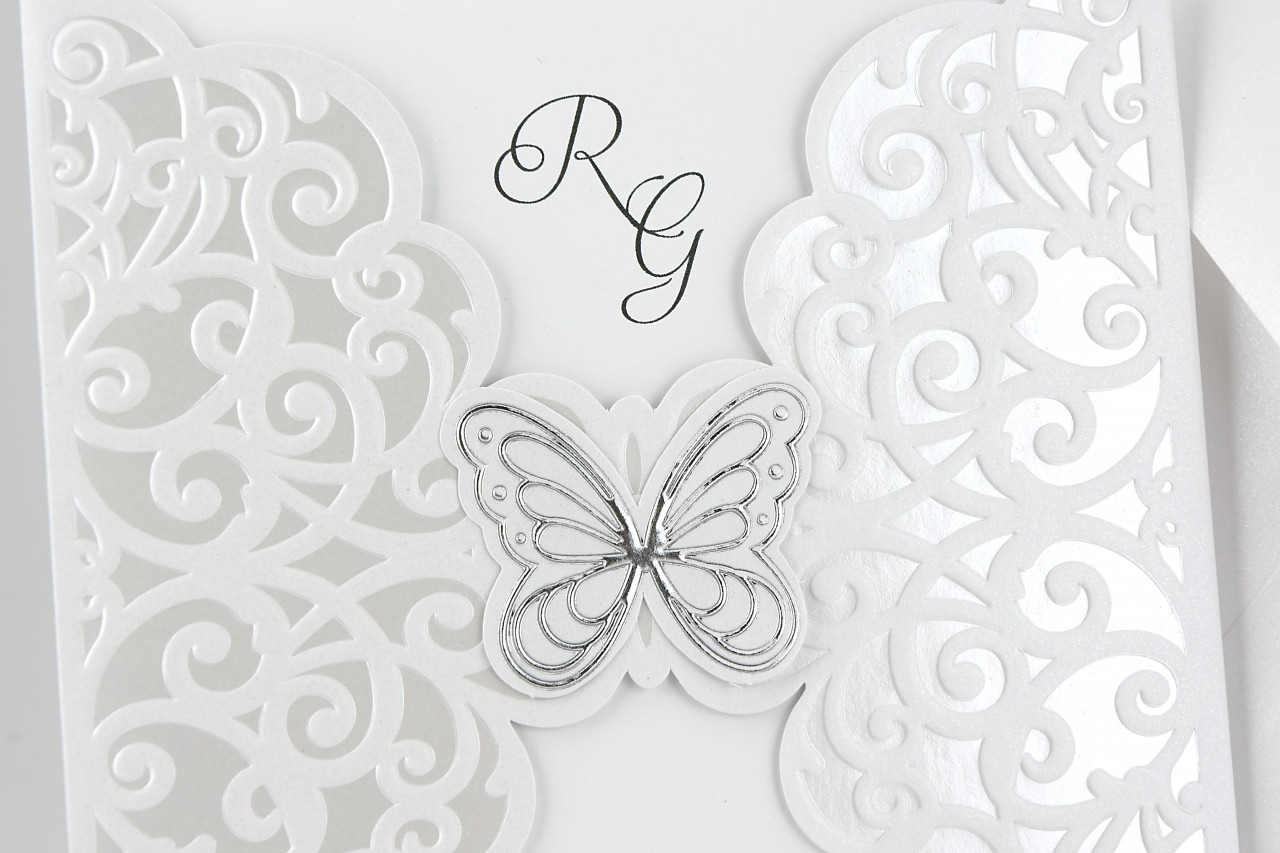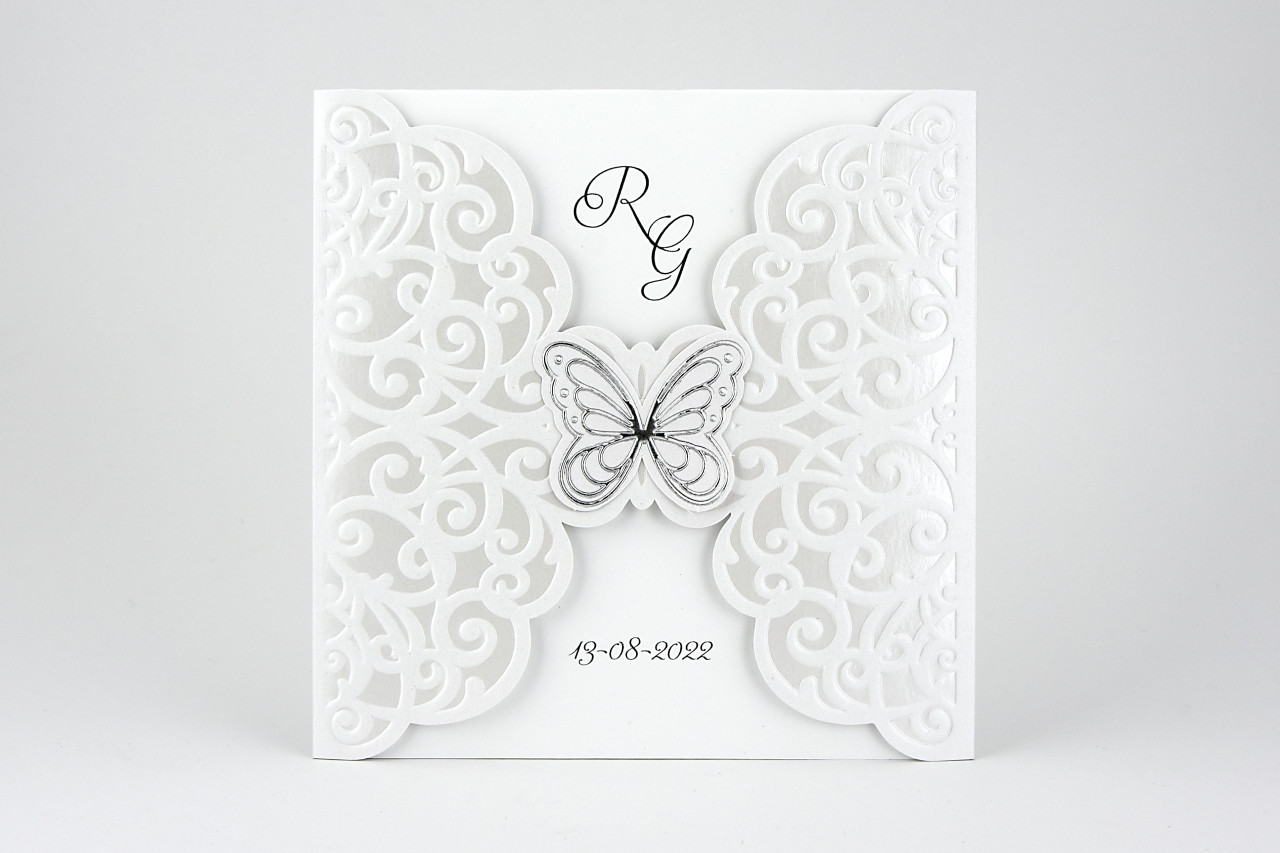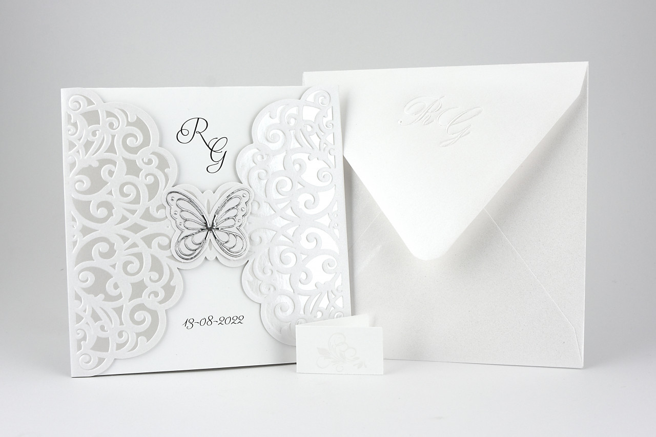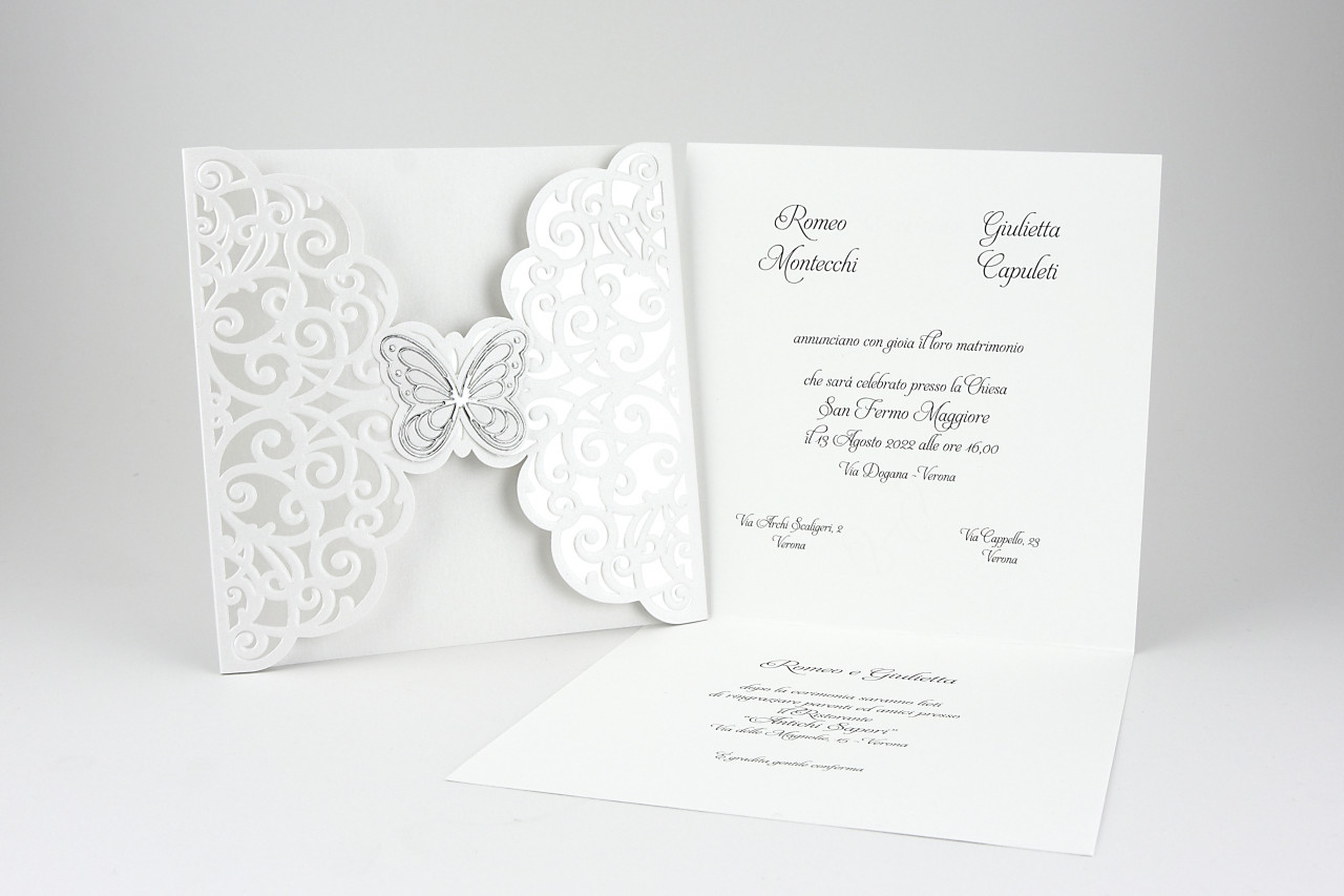 - Formato aperto: 300x150 mm- Formato chiuso: 150x150 mm- Carta Bianca Perlata 240 gr /mq (Esterno)- Carta Bianca 170 gr /mq (Interno)- Lamina a caldo perlata e rilievo- Farfalla con lamina a caldo Argento, applicazione con biadesivo spessorato- Busta, invito e biglietto bomboniera inclusi nel prezzo