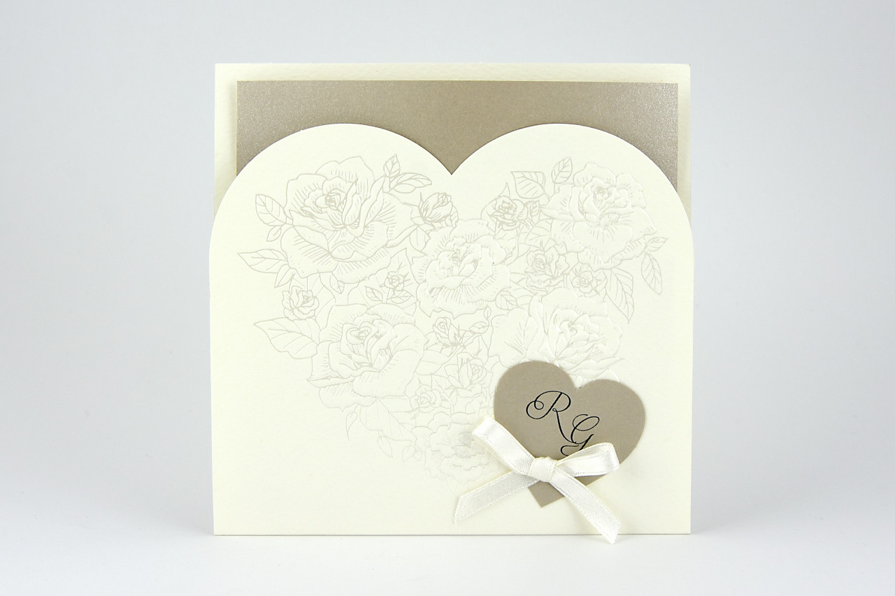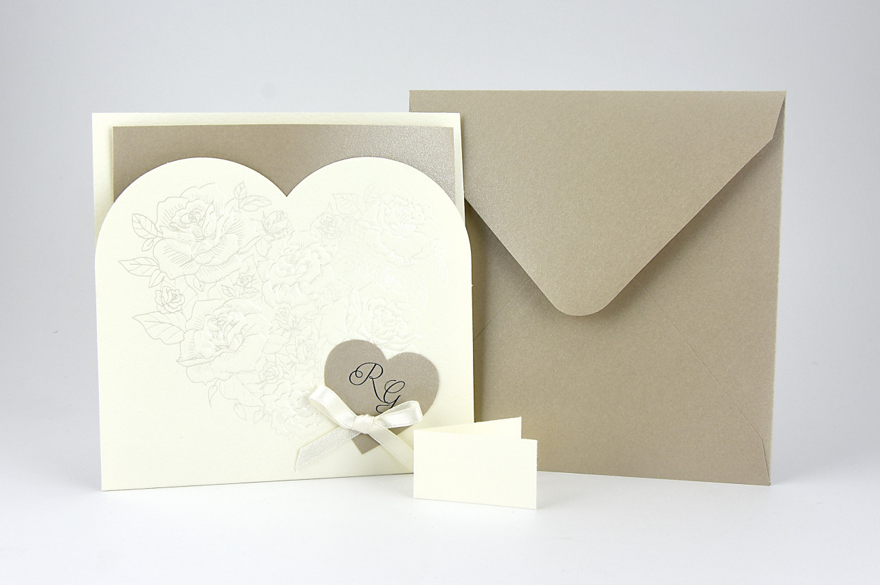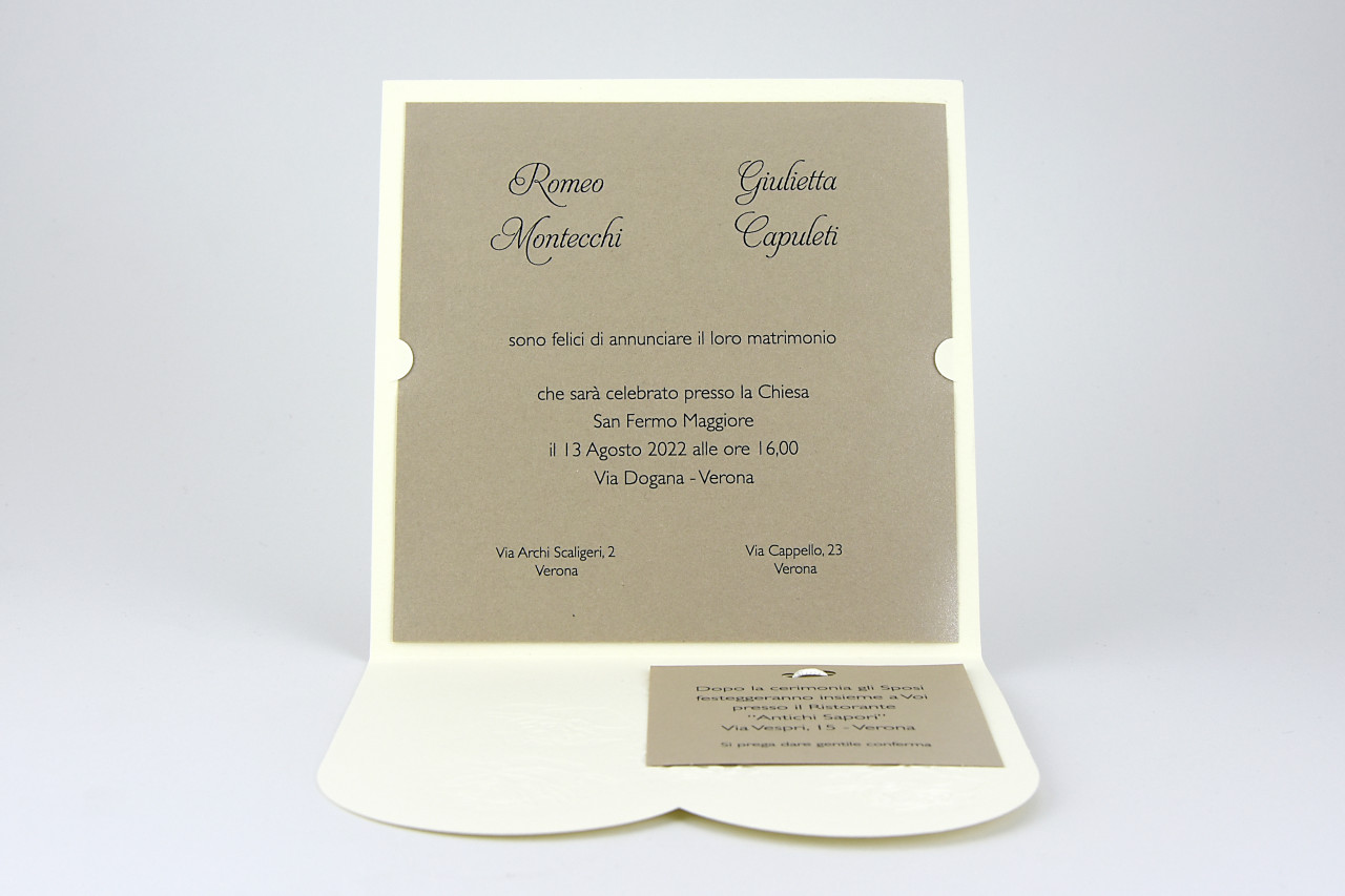 - Formato aperto: 300x150 mm- Formato chiuso: 150x150 mm- Carta Avorio 240 gr /mq (Esterno)- Carta Marrone Perlata 170 gr /mq (Interno)- Lamina a caldo perlata e rilievo- Nastro in doppio raso- Busta, invito e biglietto bomboniera inclusi nel prezzo